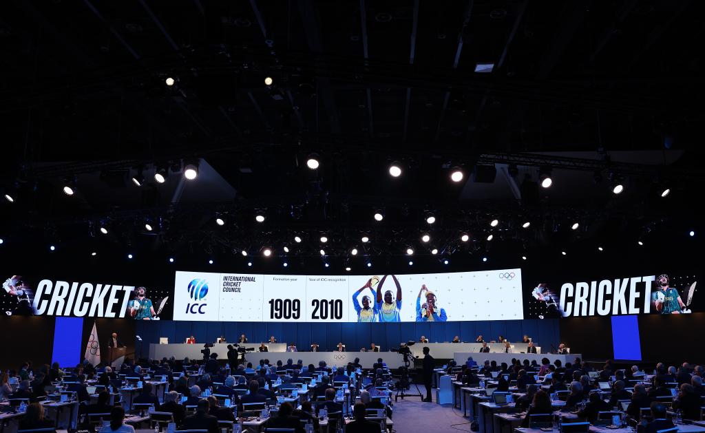 這是10月16日在印度孟買舉行的國際奧委會第141次全會現(xiàn)場大屏幕展示的板球項目。新華社記者 曹燦 攝