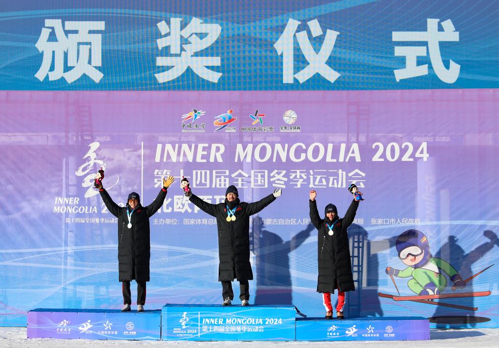 1月27日,冠軍趙嘉文(中)、亞軍范海斌(左)與季軍趙子賀在領(lǐng)獎(jiǎng)臺(tái)上。新華社發(fā)(武殿森 攝)