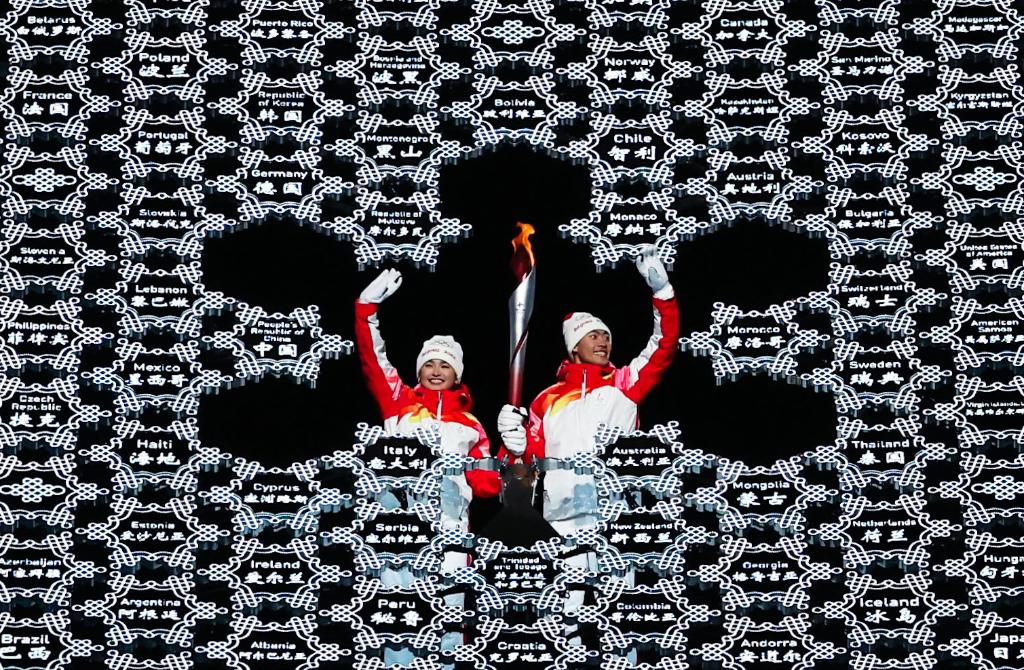2022年2月4日晚,第二十四屆冬季奧林匹克運(yùn)動(dòng)會(huì)開(kāi)幕式在北京國(guó)家體育場(chǎng)舉行。這是最后一棒火炬手迪妮格爾·衣拉木江和趙嘉文(右)。新華社記者 曹燦 攝