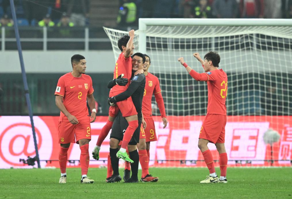 3月26日,中國(guó)隊(duì)守門員王大雷(左三)與中國(guó)隊(duì)球員韋世豪(左二)慶祝得分。新華社記者 孫凡越 攝
