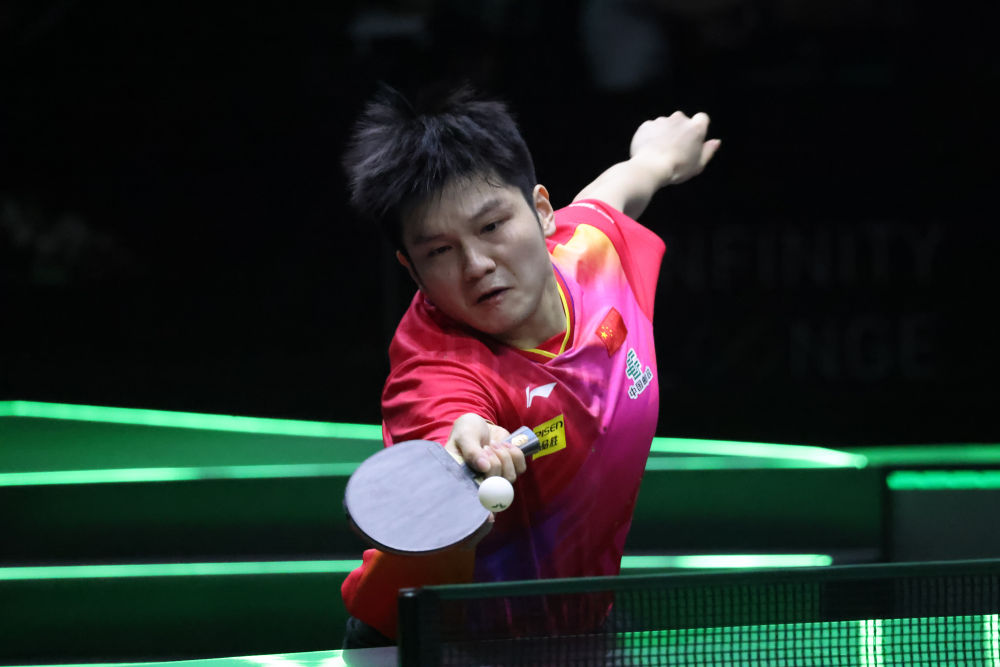 5月8日,中國選手樊振東在比賽中回球。他在男單八分之一決賽中2:3不敵德國選手弗朗西斯卡,無緣八強。新華社記者 王海洲 攝