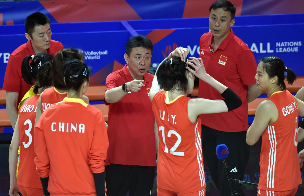 6月16日,中國隊球員袁心玥(中)在比賽中吊球。新華社記者 盧炳輝 攝