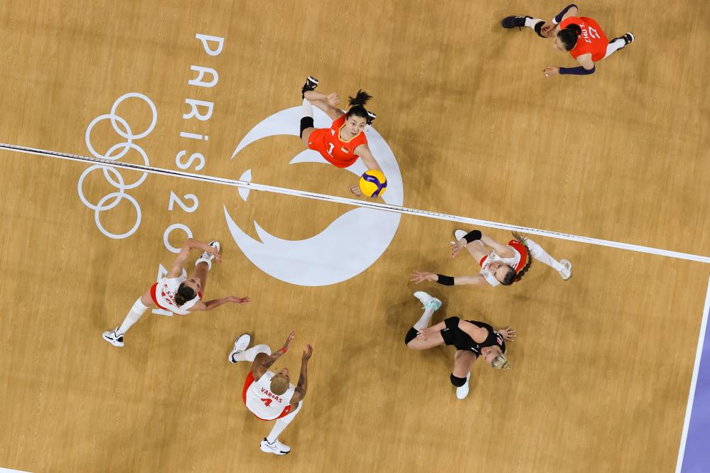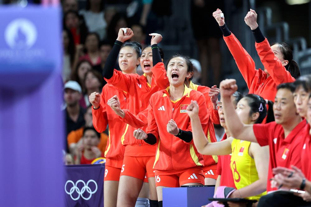 7月29日,中國(guó)女排在巴黎奧運(yùn)會(huì)女排小組賽對(duì)陣美國(guó)隊(duì)的比賽中。新華社記者 李鋼 攝