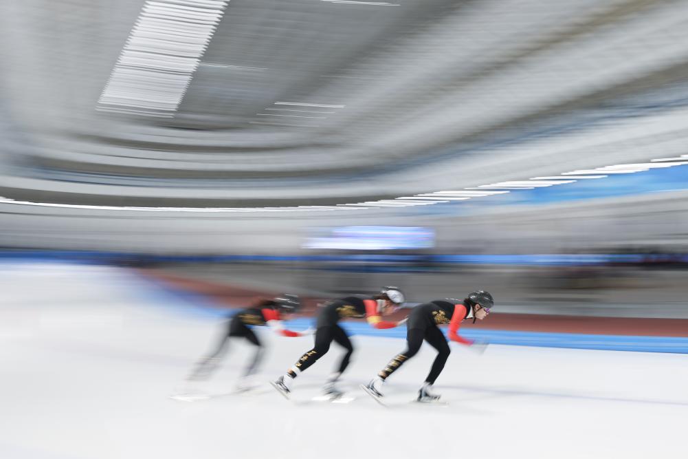 2024年12月15日,2024-2025賽季中國杯速度滑冰精英聯(lián)賽第四站暨亞冬會測試賽女子團體追逐比賽在黑龍江省冰上訓(xùn)練中心舉行。新華社記者 張濤 攝