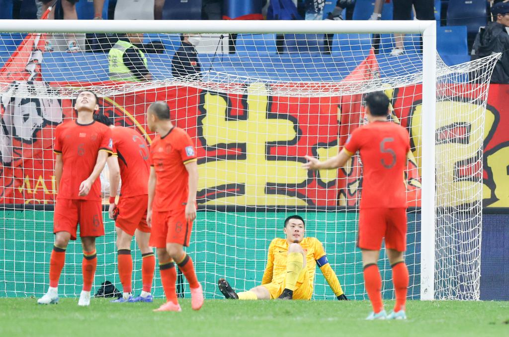 2024年9月10日,中國隊守門員王大雷(下)在球隊失球后。當日,中國隊主場1比2不敵沙特隊。新華社記者 曹燦 攝