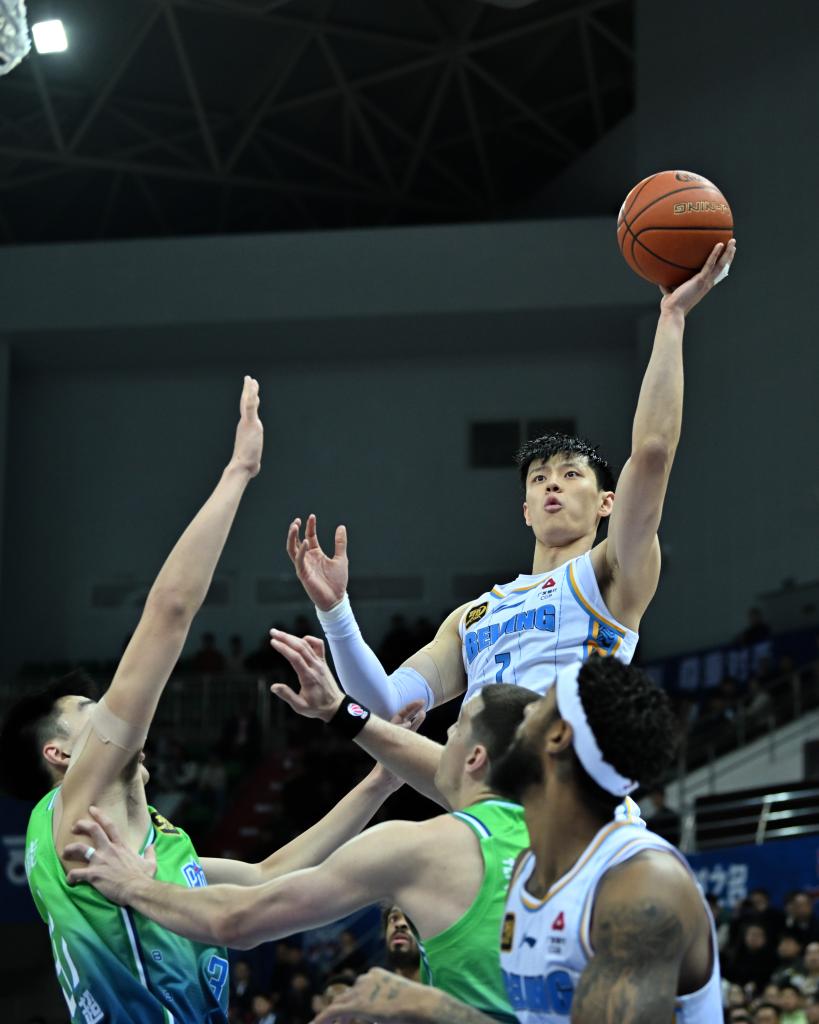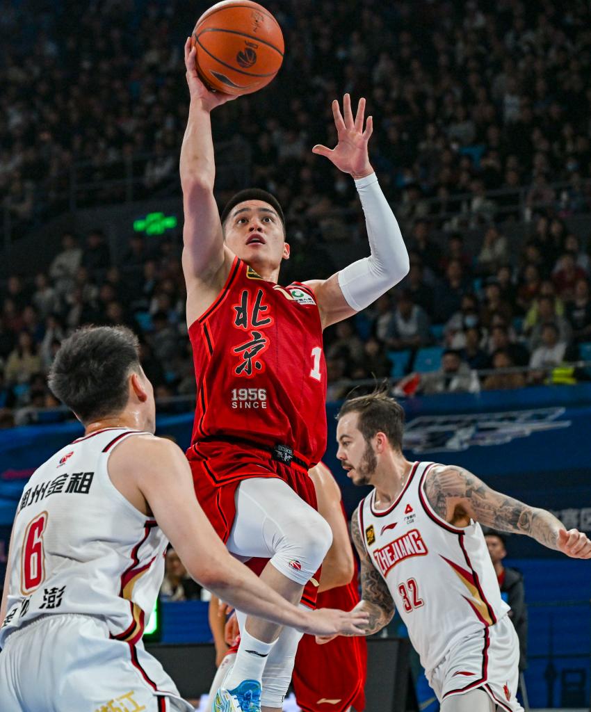 3月27日,北京隊(duì)球員陳盈駿(上)在比賽中投籃。新華社記者 陳朔 攝