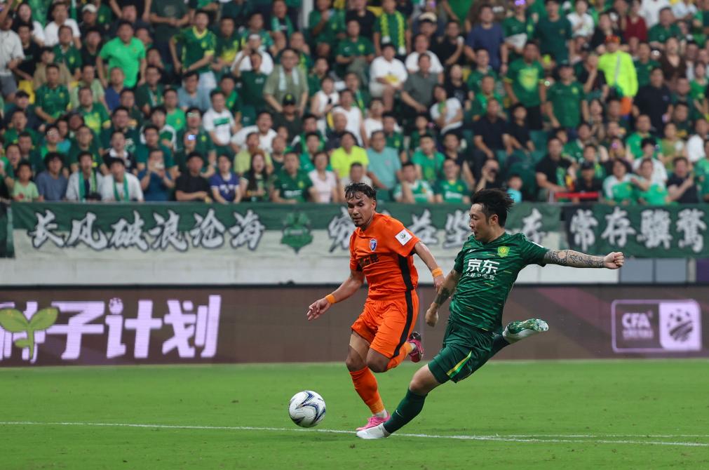 第38分鐘,老將王剛在右路突入禁區(qū)后勁射破門,幫助北京國(guó)安取得兩球領(lǐng)先。上半場(chǎng)補(bǔ)時(shí)階段,北京國(guó)安乘勝追擊,外援古加在禁區(qū)內(nèi)推射,再入一球。