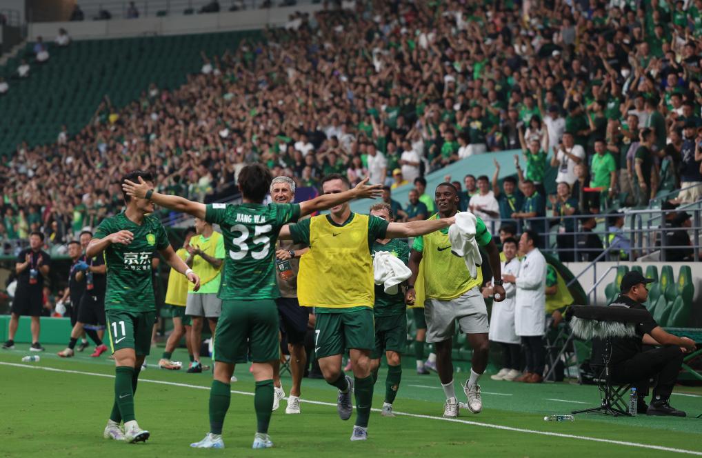 8月20日,北京國(guó)安隊(duì)球員江文豪(左二)在比賽中進(jìn)球后慶祝。新華社記者 胡星宇 攝