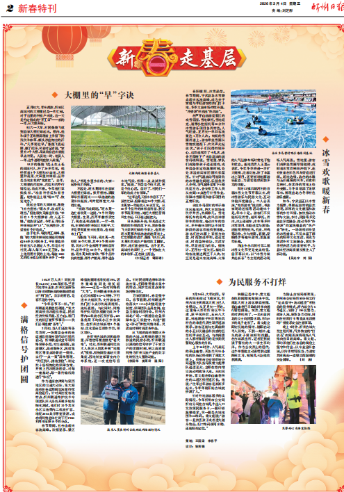 日頭漸漸升高,陽光透過大棚的塑料膜灑落下來,照在張俊飛夫妻倆忙碌的身影上,也照在班水英那片綠油油的油菜地上。忙完棚里的活計,張俊飛夫婦、班水英和其他農(nóng)戶陸續(xù)收工回家。明天,他們還會繼續(xù)。這個正月,高城村的田野上,一個更加紅火的豐收年,正在破土而出。(司麗瓊)