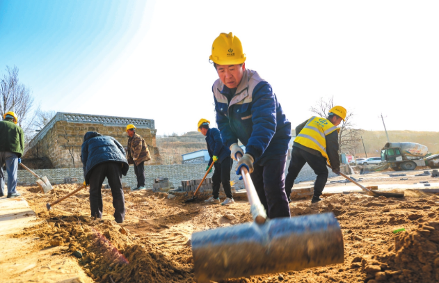 陽面村的工人正在鋪設鄉(xiāng)村驛站廣場的地面。