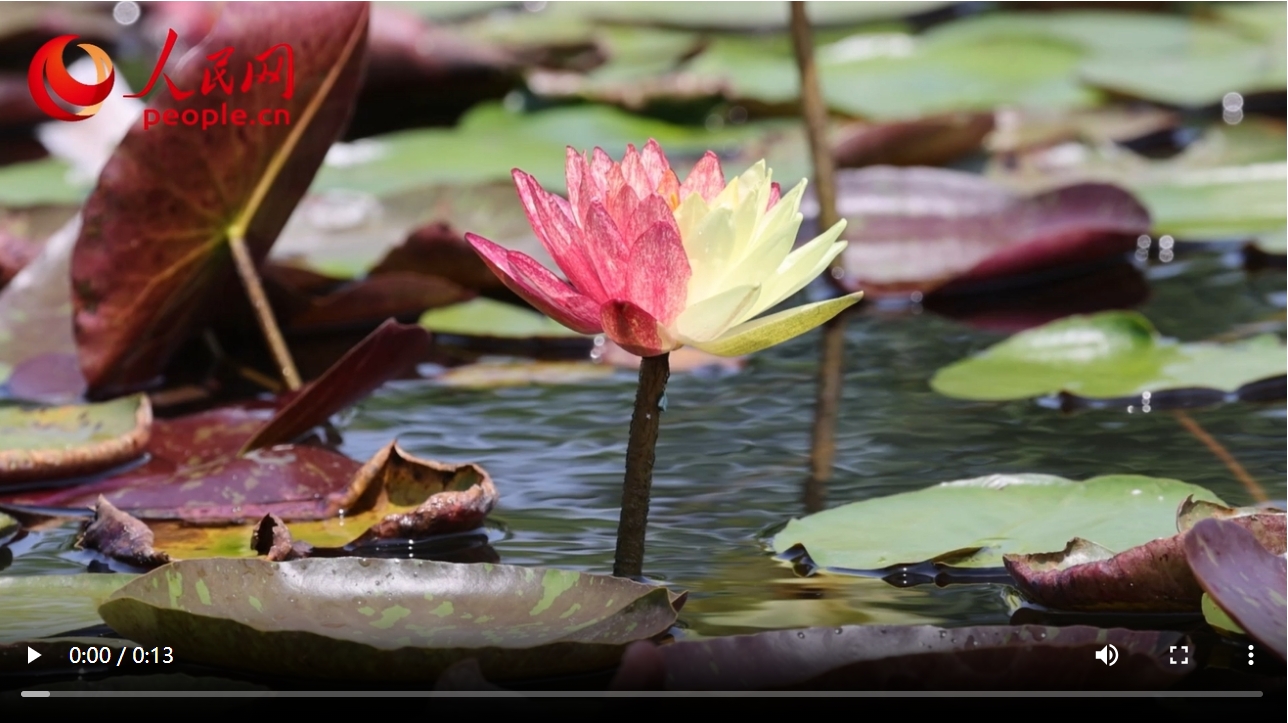 雙色睡蓮與翠綠的蓮葉、清澈的池水相映成畫(huà)。人民網(wǎng)記者 陳博攝