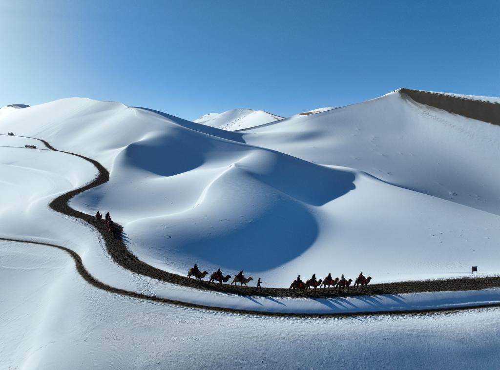 2023年11月15日拍攝的甘肅省敦煌市鳴沙山月牙泉景區(qū)雪景。張曉亮 攝