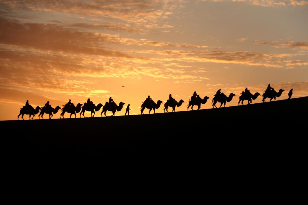 月牙泉是沙漠的眼睛,依舊倒映著漢唐的明月。駝隊曾經(jīng)從這里經(jīng)過,駝鈴聲串起長安與羅馬的夢。絲綢是流動的彩虹,瓷器是凝固的月光,經(jīng)卷里藏著智慧的種子,在歐亞大陸上生根發(fā)芽。