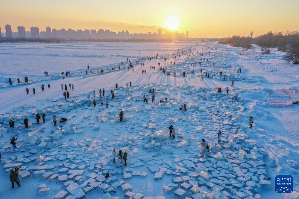 在封凍的松花江哈爾濱段,游客在日落時(shí)分的“鉆石?!庇瓮妫o人機(jī)照片,1月7日攝)。新華社記者 謝劍飛 攝