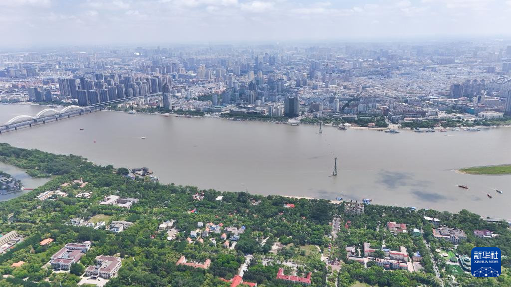 這是6月4日拍攝的哈爾濱市松花江北岸的太陽島國家濕地公園局部景色與對(duì)岸的局部城市景觀(無人機(jī)照片)。新華社記者 王松 攝