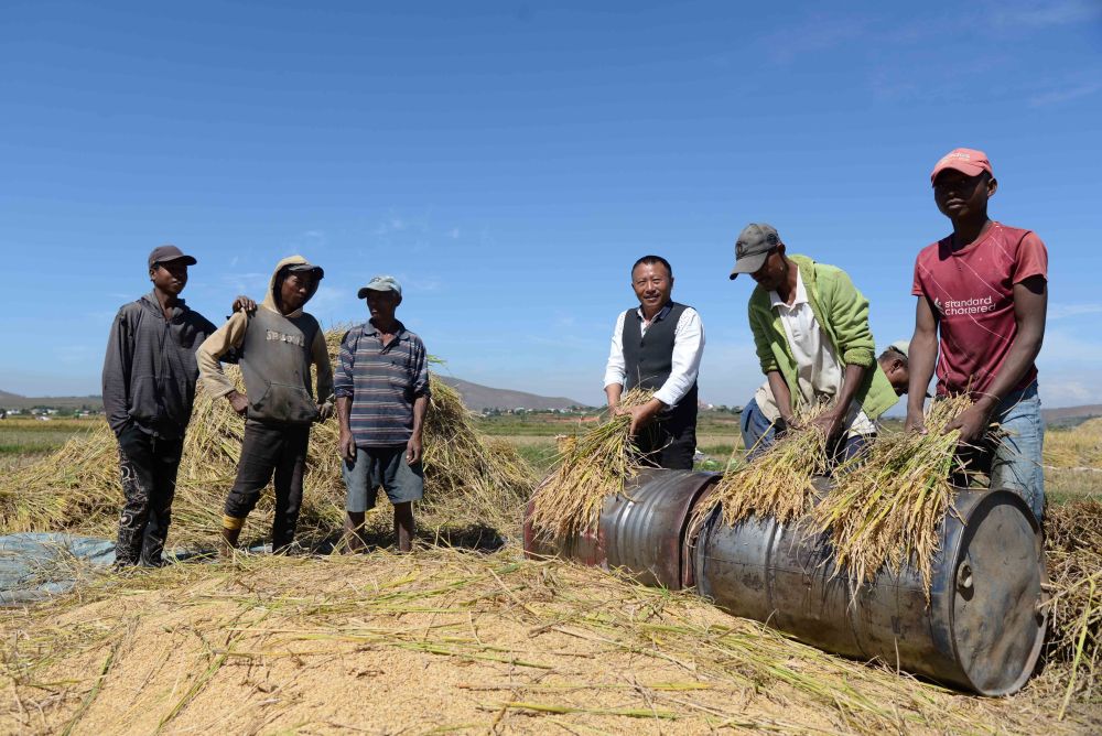 在馬達(dá)加斯加首都塔那那利佛附近的馬義奇鎮(zhèn),中國(guó)雜交水稻技術(shù)專家胡月舫(右三)在中國(guó)國(guó)家雜交水稻工程技術(shù)研究中心非洲分中心的試驗(yàn)田里和當(dāng)?shù)剞r(nóng)民一起收獲水稻(2023年5月12日攝)。新華社發(fā)(西塔卡·拉喬納里松 攝)