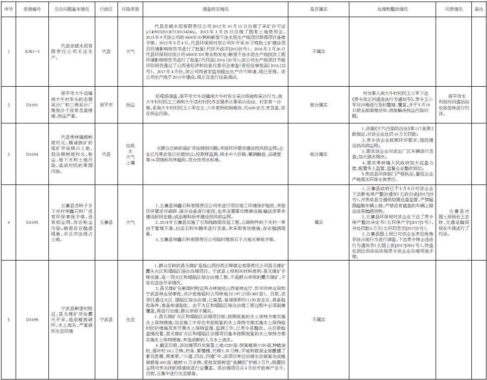 我市高度重視,立即組織查處,截至5月18日,督辦的5件群眾反映問題已辦結(jié)。其中,確認(rèn)屬實(shí)1件;確認(rèn)部分屬實(shí)2件;確認(rèn)不屬實(shí)2件。對于屬實(shí)和部分屬實(shí)已辦結(jié)的環(huán)保問題,分別采取了相應(yīng)處理措施,其中停產(chǎn)整治1件,罰款6萬元,對3名相關(guān)責(zé)任人進(jìn)行約談。對5件群眾反映問題調(diào)查處理情況進(jìn)行了信息公開。