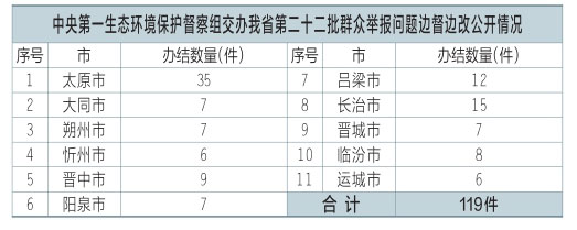 中央第一生態(tài)環(huán)境保護(hù)督察組交辦我省第二十二批群眾舉報(bào)問題119件,辦結(jié)119件。公示119件,其中太原市35件、大同市7件、朔州市7件、忻州市6件、晉中市9件、陽泉市7件、呂梁市12件、長(zhǎng)治市15件、晉城市7件、臨汾市8件、運(yùn)城市6件??傻卿浬轿魇∪嗣裾W(wǎng)站或掃描二維碼查閱群眾信訪舉報(bào)轉(zhuǎn)辦和邊督邊改公開情況一覽表。