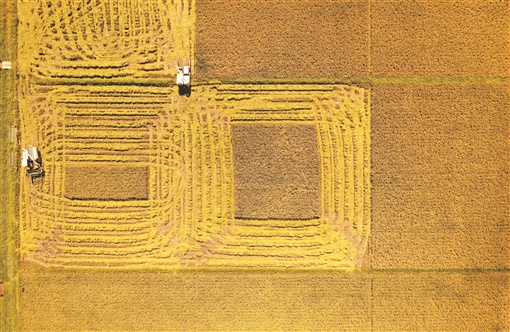 5月9日上午,湖南雜交水稻研究中心海南省三亞市海棠灣基地,收割機對水稻試驗示范田進行收割。湖南日報·新湖南客戶端首席記者 郭立亮 攝