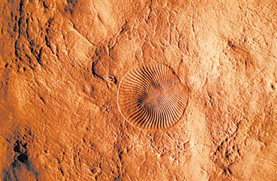 南澳大利亞尼佩納·埃迪卡拉國家公園砂巖中的埃迪卡拉紀(jì)化石狄更遜水母(中)與較小的錨形帕文柯利納蟲(左)的圖像。圖片來源:斯科特·埃文斯