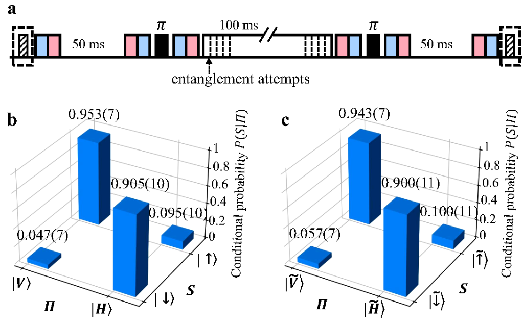 實驗發(fā)現(xiàn),通過此方法制備出的通訊比特,可在數(shù)百毫秒的時間內(nèi)生成離子-光子糾纏;通過自旋回波方法可延長存儲比特的存儲壽命,實現(xiàn)相干時間達到秒量級的存儲量子比特。通過比較有無離子-光子糾纏生成操作時存儲比特的保真度變化,研究人員證實了兩種量子比特之間低于實驗精度的串擾誤差,從而實現(xiàn)了無串擾的量子網(wǎng)絡節(jié)點。