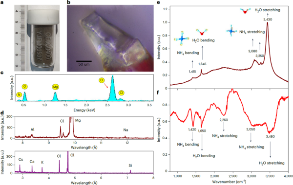 團(tuán)隊(duì)研究發(fā)現(xiàn),ULM-1的分子式中含有多達(dá)6個(gè)結(jié)晶水,水分子在樣品中的質(zhì)量比高達(dá)41%。從晶體的紅外光譜和拉曼光譜上,均可以清晰觀察到源于水分子和銨的特征振動(dòng)峰。