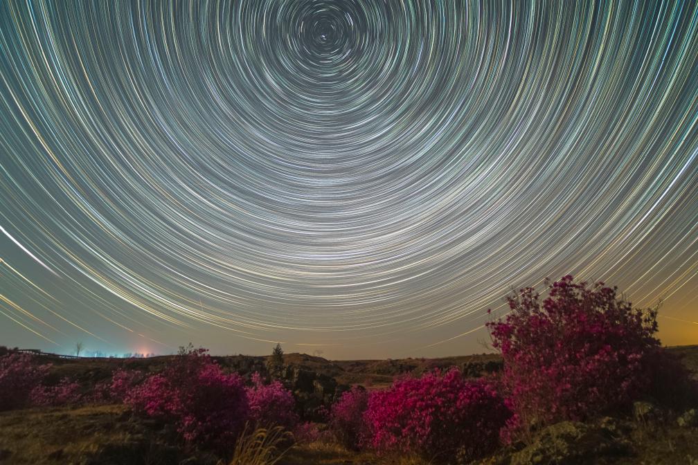 在黑龍江省牡丹江市寧安市拍攝的杜鵑花和星軌(5月1日攝,堆棧合成照片)。新華社發(fā)(王寶勛攝)