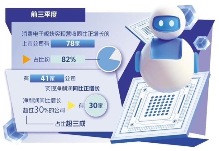 今年以來,消費(fèi)電子板塊復(fù)蘇明顯。數(shù)據(jù)顯示,前三季度,消費(fèi)電子板塊實(shí)現(xiàn)營收同比正增長的上市公司有78家,占比約82%;有41家公司實(shí)現(xiàn)凈利潤同比正增長,凈利潤同比增長超過30%的公司有30家,占比超三成。尤其是第三季度,行業(yè)延續(xù)復(fù)蘇趨勢,一批公司實(shí)現(xiàn)營收、凈利潤的雙增長。