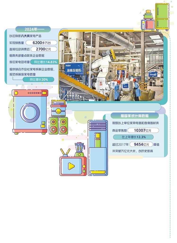 自《推動(dòng)大規(guī)模設(shè)備更新和消費(fèi)品以舊換新行動(dòng)方案》(以下簡(jiǎn)稱(chēng)《行動(dòng)方案》)實(shí)施以來(lái),家電市場(chǎng)消費(fèi)潛力得到顯著釋放。數(shù)據(jù)顯示,2024年,中央加力支持以舊換新八大類(lèi)家電產(chǎn)品實(shí)現(xiàn)銷(xiāo)售量6200多萬(wàn)臺(tái),直接拉動(dòng)消費(fèi)近2700億元。日前,國(guó)家發(fā)展改革委副主任趙辰昕在國(guó)務(wù)院政策例行吹風(fēng)會(huì)上介紹,2025年將延續(xù)并加力擴(kuò)圍實(shí)施“兩新”政策,享受以舊換新補(bǔ)貼的家電產(chǎn)品種類(lèi)由2024年的8類(lèi)增至12類(lèi),單件最高補(bǔ)貼可達(dá)銷(xiāo)售價(jià)格的20%。