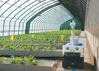 3月21日,無人巡檢機器人在天津一家智慧農(nóng)業(yè)園區(qū)內(nèi)巡控。新華社記者 孫凡越攝