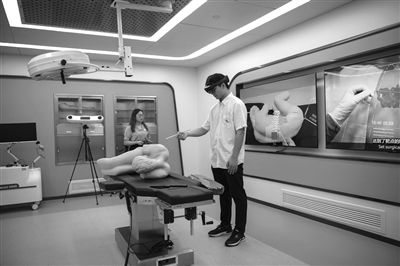 在位于安徽省蕪湖市的“中國(guó)視谷”,工作人員在模擬手術(shù)室里演示數(shù)字化手術(shù)輔助平臺(tái)。新華社發(fā)(肖本祥 攝)