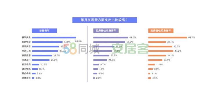 吃,是一大生活樂趣來(lái)源。報(bào)告顯示,63.8%的單身青年表示每月在餐飲美食上的花銷占比較高。此外,住房物業(yè)、服飾美容、生活日用等方面也是單身青年的主要開銷。