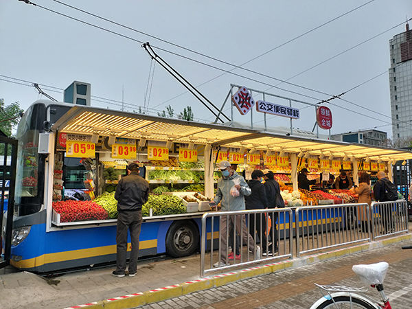 柳芳地鐵站附近開設(shè)“公交便民驛?!?,方便居民購買果蔬。人民網(wǎng)實習(xí)生 曹瑞穎攝