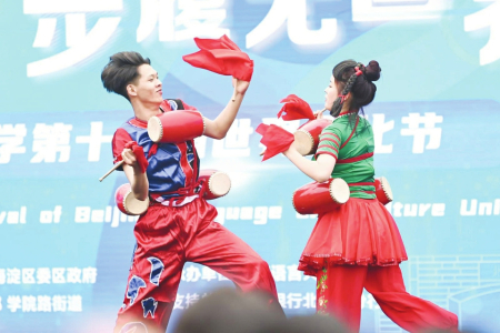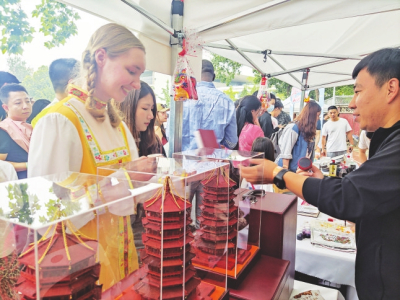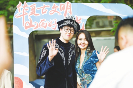 當(dāng)日活動(dòng)吸引了來(lái)自世界各地的3萬(wàn)余名師生及社會(huì)各界人士。獨(dú)唱《人說山西好風(fēng)光》《千年一塔》,舞蹈《醋之韻》《翼城花鼓》等贏得師生們熱烈掌聲。在五大洲文化展區(qū),絳州木版年畫傳承人吳百鎖現(xiàn)場(chǎng)印制木版年畫贈(zèng)送師生,成為一道亮麗風(fēng)景。廣靈剪紙、應(yīng)縣木塔模型、黎侯虎、寧武毛健茶等吸引各國(guó)留學(xué)生駐足欣賞。“華夏古文明山西好風(fēng)光”主題相框前,無(wú)數(shù)外國(guó)友人饒有興趣交流互動(dòng),拍照留念?!吧轿髟亍被鸨本┱Z(yǔ)言大學(xué)世界文化節(jié)。