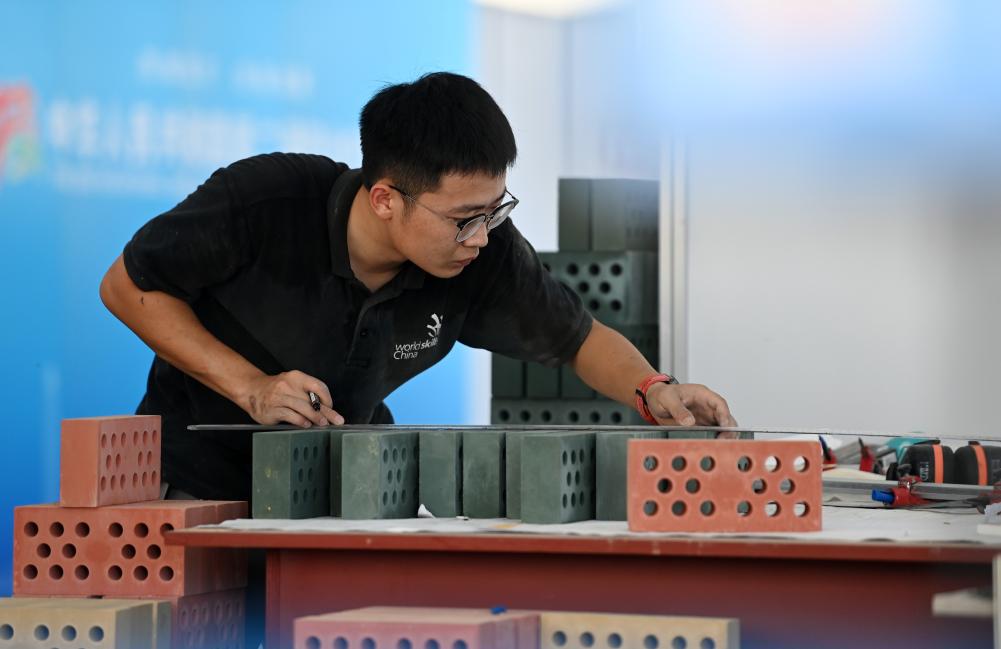 2023年9月17日,在國家會展中心(天津)舉辦的中華人民共和國第二屆職業(yè)技能大賽進(jìn)入第二天,參賽選手在參加砌筑項(xiàng)目比賽。新華社記者 趙子碩 攝