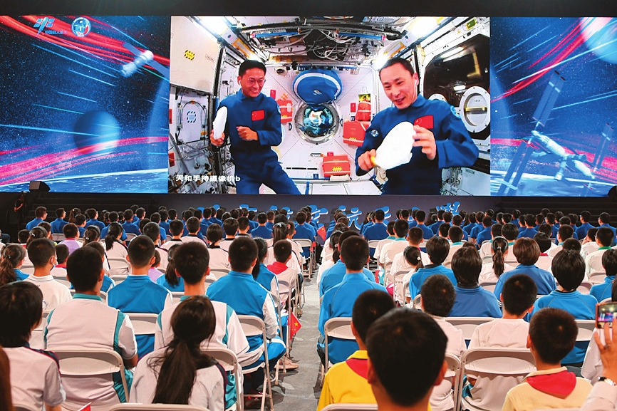 9月21日下午,“天宮課堂”第四課在中國空間站開講,新晉“太空教師”景海鵬、朱楊柱、桂海潮為廣大青少年帶來一場精彩的太空科普課,這是中國航天員首次在夢天實驗艙內進行授課。