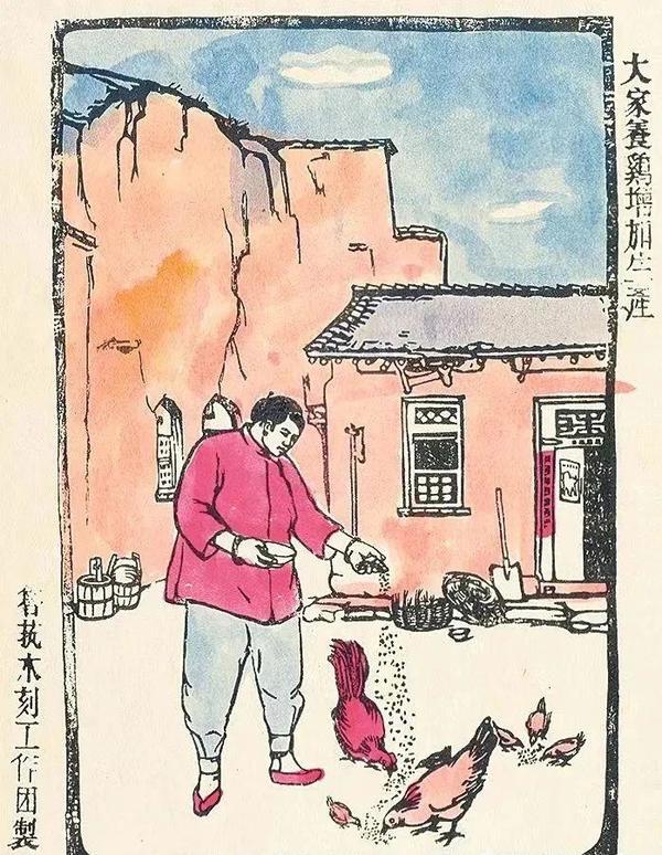 魯藝木刻工作團制作的新年畫《大家養(yǎng)雞增加生產(chǎn)》。新華社發(fā)(延安魯藝文化中心供圖)