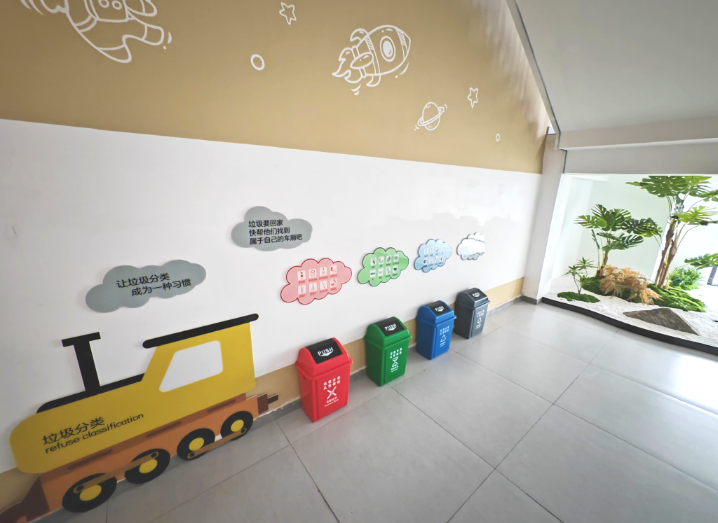 3月28日,悅?cè)菪W(xué)教學(xué)樓內(nèi)的垃圾分類箱。新華社記者楊帆攝