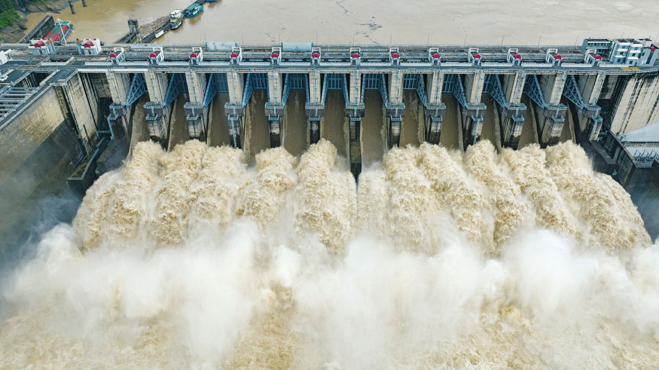 圖為6月16日,福建省閩江水口水電站12扇閘門全部開啟泄洪。