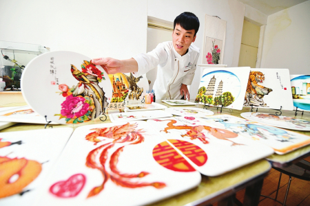 在阿峰工作室內(nèi),擺放著很多這幾年他精心制作的果醬畫作品,在方形和圓形的瓷盤上,有風(fēng)景、動(dòng)物、建筑……每一幅都栩栩如生,不僅細(xì)膩美觀,還可食用?!捌饺绽?,我除了工作,最喜歡在安靜的時(shí)候琢磨,有時(shí)為了一個(gè)作品要花上五六個(gè)小時(shí)來創(chuàng)作。果醬畫讓我大開眼界,不僅能畫出流暢的線條,還能畫出五彩斑斕的世界,更讓我找到了人生的目標(biāo)?!卑⒎褰榻B。
