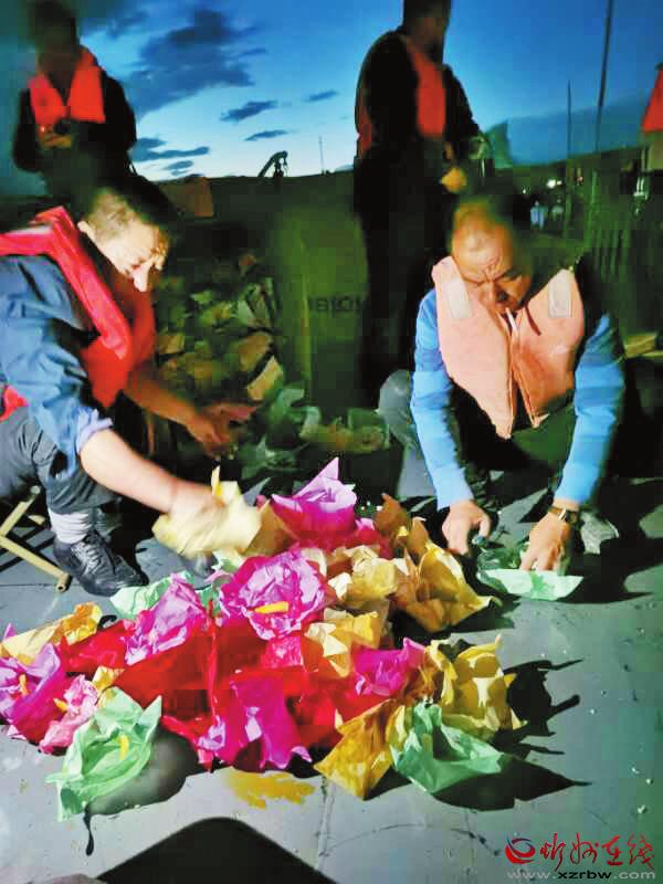 一盞盞花燈放入河中。色彩艷麗的河燈順著黃河主航道向前漂移,燈點綴河,河簇擁燈,無比壯觀。從早先放365盞燈,到現(xiàn)在的3650盞燈,場面更加宏大輝煌。