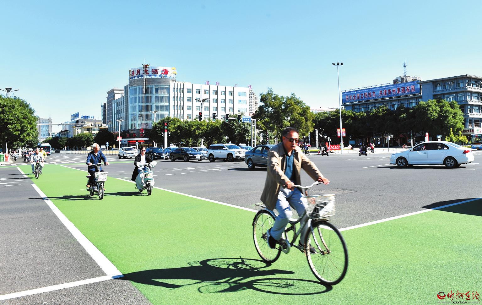 9月3日,市民在忻州城區(qū)七一路與長征街交叉路口的自行車專用道上騎行。日前,忻州路面上出現(xiàn)人車分離“斑馬線”,行人走斑馬線、騎行則走專用自行車道,很好地實現(xiàn)了人和非機動車分流通過,為創(chuàng)建文明城市增色。 宮清華 攝