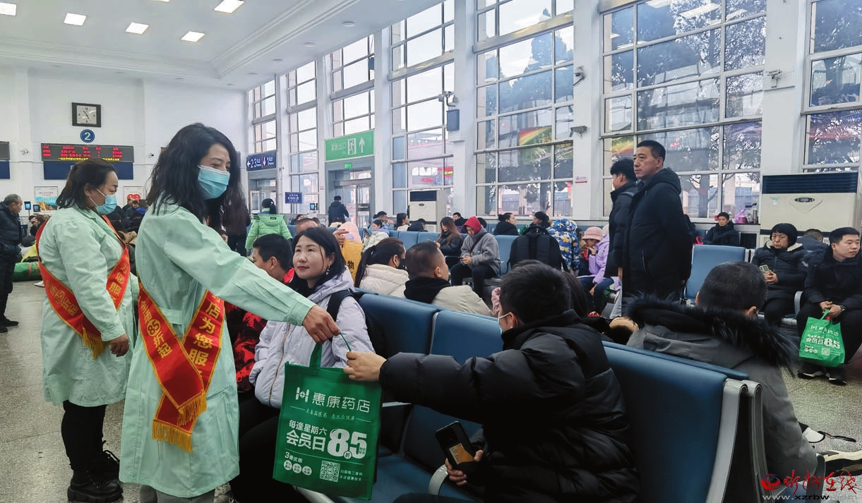 近日,國內(nèi)知名藥企廣州白云山和記黃埔中藥有限公司攜手我市當(dāng)?shù)厮幤箝_展春運愛心公益活動。圖為工作人員在忻州火車站向候車乘客發(fā)放防流感藥品、口罩等健康禮包。(李建中攝)