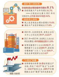 統(tǒng)計數(shù)據(jù)顯示,2021年—2024年,全省制造業(yè)增加值年均增長8.1%,戰(zhàn)略性新興產(chǎn)業(yè)年均增長8.7%,占制造業(yè)比重從2021年的32%逐年上升至2024年的44%。2025年上半年全省規(guī)上裝備制造業(yè)增加值增長9.6%,高技術(shù)產(chǎn)業(yè)投資增速達(dá)17.8%,戰(zhàn)略性新興產(chǎn)業(yè)對工業(yè)增長貢獻(xiàn)率日漸提高。