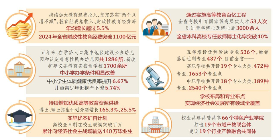 11月11日上午,中共山西省委宣傳部、山西省人民政府新聞辦公室組織召開“高質(zhì)量完成‘十四五’規(guī)劃”系列主題第二場新聞發(fā)布會,省教育廳有關負責同志介紹情況,并回答記者提問。 教育是國之大計、黨之大計,也是每個家庭的心頭事?!笆奈濉币詠?,在省委、省政府堅強領導下,全省教育系統(tǒng)深入貫徹落實習近平總書記關于教育的重要論述,全面貫徹黨的教育方針,堅定落實教育優(yōu)先發(fā)展戰(zhàn)略,有力推動“十四五”規(guī)劃各項指標任務全面完成,為“十五五”時期加快建設教育強省奠定了堅實基礎。 落實立德樹人根本任務,提供普惠優(yōu)質(zhì)教育公共服務,老百姓的教育獲得感不斷增強 “十四五”期間,我省堅定不移用新時代黨的創(chuàng)新理論鑄魂育人,系統(tǒng)推動習近平新時代中國特色社會主義思想進教材、進課堂、進頭腦。實施高校黨建工作規(guī)范提升專項行動,全面加強民辦學校黨建工作,推動中小學校黨組織領導的校長負責制全面落地。培育32個教育部“雙創(chuàng)”項目、203個省級“育人先鋒”品牌,輻射帶動立德樹人提質(zhì)增效。省黨政領導每年登上講臺講授思政課,形成強有力示范效應。實施“時代新人鑄魂工程”和“大思政課”建設工程,全覆蓋建立校地協(xié)作平臺,持續(xù)推進大中小學思政課一體化改革創(chuàng)新。全面加強學生心理健康工作,持續(xù)完善家校社協(xié)同育人機制,加快“五育融合”體系建設,我省學生在多項體育賽事中取得歷史佳績,“身上有汗、眼里有光、心中有夢、腳下有力”正在成為全省青少年最美的成長注腳。 省委教育工委書記,省教育廳黨組書記、廳長馬駿介紹,“十四五”期間,我省持續(xù)加大教育經(jīng)費投入,堅定落實“兩個只增不減”,教育經(jīng)費總收入、財政性教育經(jīng)費等年均增長超過5.5%,2024年全省財政性教育經(jīng)費突破1100億元。推進基礎教育擴優(yōu)提質(zhì),組建600個城鄉(xiāng)教育共同體,有序增加高中學位供給,20萬人口以上的縣實現(xiàn)特殊教育學校全覆蓋,隨遷子女、殘疾兒童平等接受教育得到充分保障。學生資助體系實現(xiàn)學段、學校、學生全覆蓋,累計惠及1373萬人次。今年起免除公辦幼兒園學前一年保教費,群眾的教育獲得感、幸福感持續(xù)提升。 建設教育強省,基礎教育是基點?!笆奈濉逼陂g,我省對標教育強國、教育強省建設總體部署,積極回應人民群眾對“上好學”的熱切期盼,扎實開展基礎教育的擴優(yōu)提質(zhì)行動。省委教育工委委員,省教育廳副廳長侯文一介紹,我省持續(xù)加大教育經(jīng)費投入力度,為基礎教育高質(zhì)量發(fā)展奠定了堅實基礎,積極應對學齡人口“梯次渡峰”,推進建立與人口變化相適應的基礎教育資源配置機制,持續(xù)優(yōu)化學校布局。五年來,在學齡人口集中地區(qū)建設公辦幼兒園和認定普惠性民辦幼兒園共1286所、新改擴建義務教育寄宿制學校1700余所,中小學辦學條件明顯改善,2024、2025兩年增加普通高中學位6.73萬個,更好地滿足了群眾希望接受普通高中教育的期盼。我省推動學前教育普及普惠發(fā)展,著力提升幼兒園科學保教水平;通過教師交流、集團化辦學等方式,全面推進縣域義務教育優(yōu)質(zhì)均衡發(fā)展,持續(xù)縮小城鄉(xiāng)、區(qū)域、校際差距,努力辦好群眾“家門口的好學校”;持續(xù)穩(wěn)定縣中生源,建強縣中教師隊伍,組織高校和省示范高中對口支持薄弱縣中,縣中辦學質(zhì)量穩(wěn)步提升。 堅持教育科技人才一體發(fā)展,教育支撐服務經(jīng)濟社會發(fā)展更加有力 高等教育百億工程是省委、省政府站在推動教育強國、教育強省建設的戰(zhàn)略高度,謀劃實施的一項旨在“夯基壘臺”的重大工程,2023年啟動,2025年收官。省委教育工委委員、省教育廳副廳長李金碧介紹,三年來,工程安排100億元財政資金,聚焦立德樹人、院校布局、學科建設、專業(yè)發(fā)展、科學研究和內(nèi)部治理六個方面,實施了20項具體行動,全省高校辦學能力和水平得到顯著提升。 高等教育戰(zhàn)略布局更加優(yōu)化,新設、轉設11所高校,新增1所博士學位授予高校、3所碩士學位授予高校,全省設區(qū)市實現(xiàn)本??聘咝H采w,形成以山西中部城市群為核心的高等教育集聚圈,以及以晉北、晉東南、晉南為基點的高等教育集聚區(qū),“一核引領、三圈聯(lián)動、省市協(xié)同”的人才培養(yǎng)版圖基本成型。學科專業(yè)建設和內(nèi)涵發(fā)展水平全面提升,三個學科首次晉級A類學科,三個國家“雙一流”學科取得重要進展。持續(xù)增加優(yōu)質(zhì)高等教育資源供給,博士、碩士招生計劃分別增長165.3%、25.5%,實施優(yōu)本擴容計劃,高校全日制在校生規(guī)模突破百萬,累計向經(jīng)濟社會主戰(zhàn)場輸送140萬畢業(yè)生。高??萍紕?chuàng)新能級大幅提高,高層次人才引育成效明顯,國家級創(chuàng)新領軍人才增至150人,國家級重大科技創(chuàng)新平臺增至42個,百余個產(chǎn)業(yè)學院實現(xiàn)全省重大戰(zhàn)略、重點產(chǎn)業(yè)、重要領域全覆蓋,一批重大科技項目成功轉化落地。目前高校集聚全省60%以上重點實驗室、70%以上國家級領軍人才,獲得80%以上國家和省部級科技獎項,承擔90%以上國家自然科學基金項目,已成為我省科技