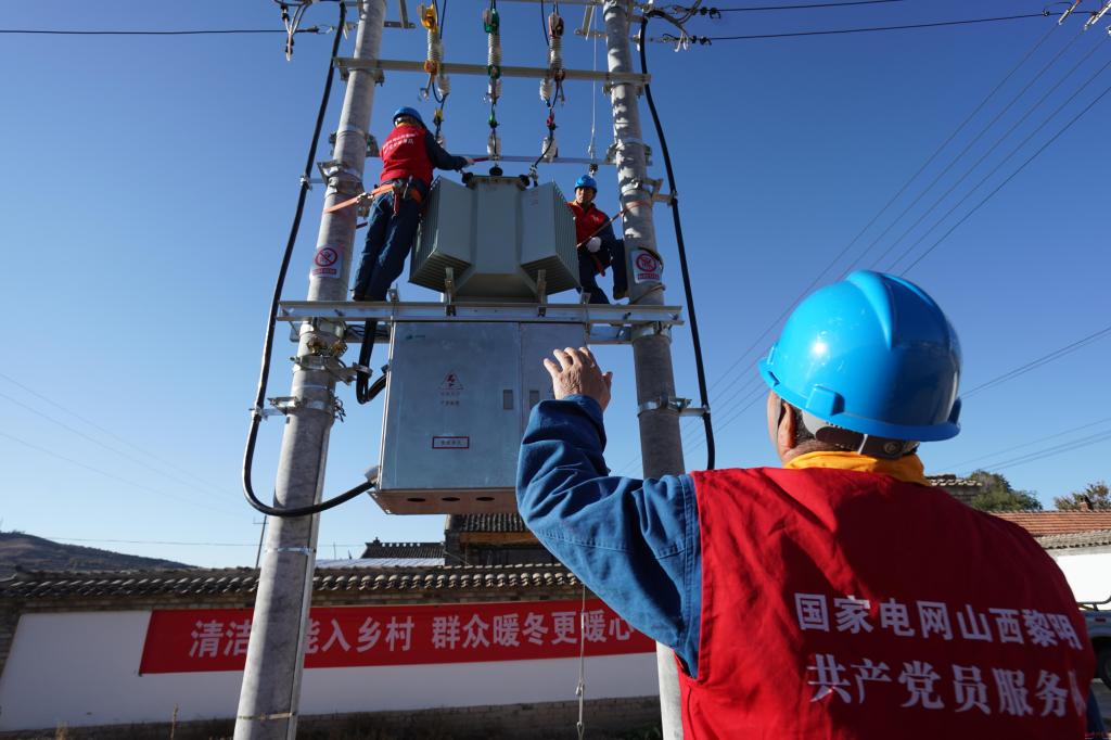 山西-電網(wǎng)建設(shè)-2020年10月3日,國網(wǎng)岢嵐縣供電公司員工在團城子村“煤改電”現(xiàn)場緊固高壓引線設(shè)備線夾(邊武攝)