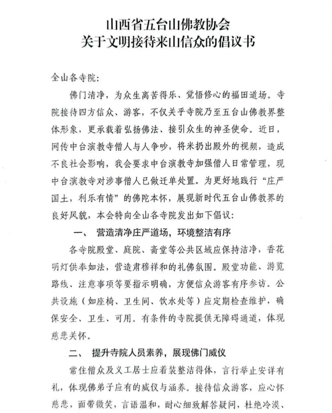 山西省五臺(tái)山佛教協(xié)會(huì)關(guān)于文明接待來(lái)山信眾的倡議書(shū)