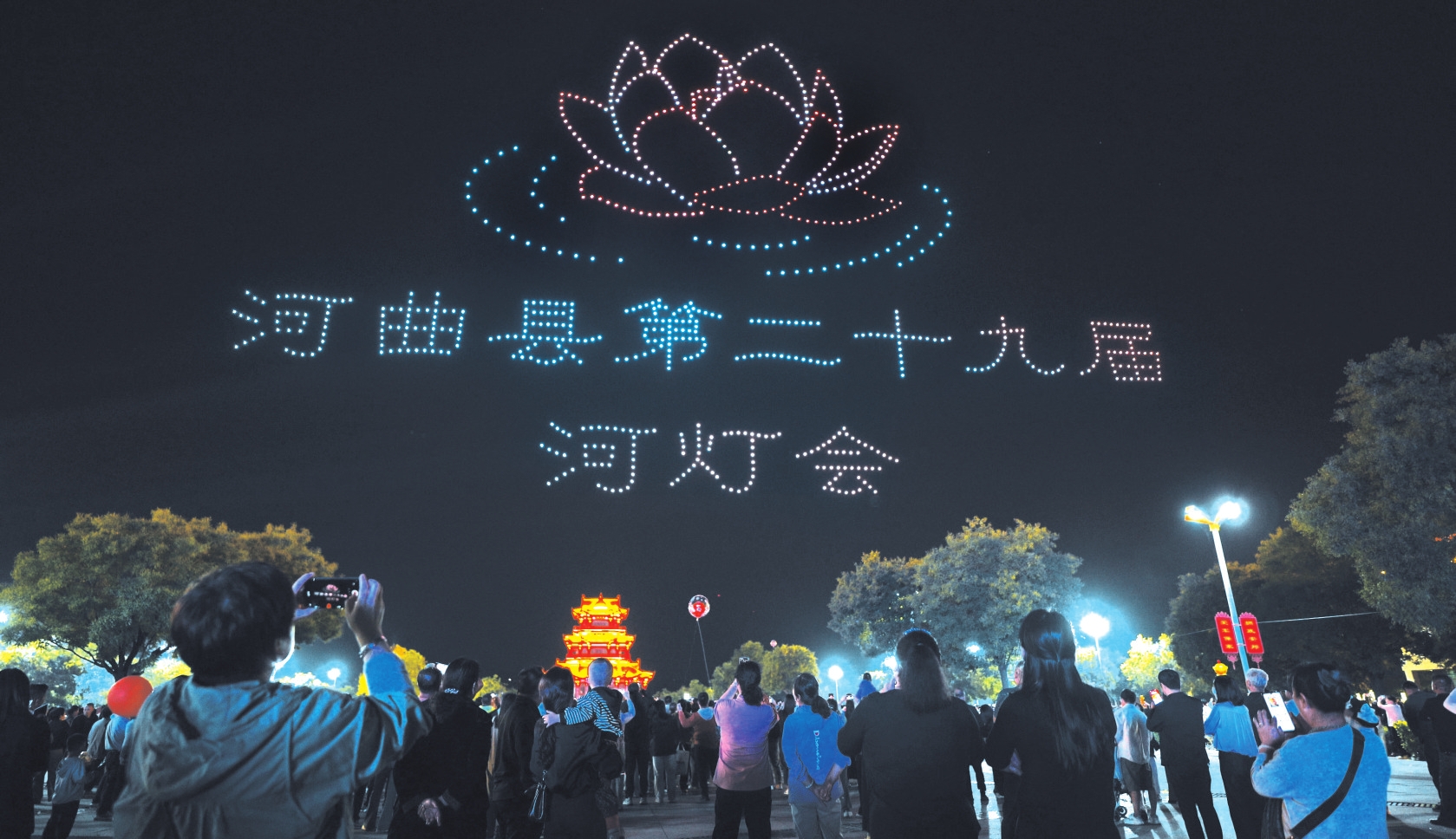 為期三天的無人機(jī)表演,創(chuàng)新采用3D動(dòng)態(tài)編隊(duì)技術(shù),通過40組高精度畫面切換,將河曲的地理標(biāo)志、文化符號(hào)與時(shí)代精神深度融合,實(shí)現(xiàn)“一幕一主題、幀幀皆故事”的沉浸式體驗(yàn),以“科技+文旅”讓市民和游客領(lǐng)略大美河曲的獨(dú)特魅力。市民張一婷說:“能在家門口看到這么高水平的無人機(jī)表演,挺自豪的。這種創(chuàng)新的‘文化表達(dá)’方式將我們家鄉(xiāng)的故事用高科技手段‘寫’在了夜空這張畫卷上。這說明家鄉(xiāng)的發(fā)展不只在經(jīng)濟(jì)方面,更是一種文化上的自信與創(chuàng)新。河燈與無人機(jī)燈光天地呼應(yīng),是傳統(tǒng)與現(xiàn)代的完美融合。”