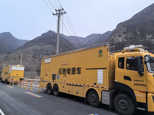 16時38分,保電隊伍準時抵達作業(yè)現場。公路兩側是嶙峋的石灰?guī)r山體,一旁河灘碎石裸露、河水潺潺,春日的天空蒙著一層薄霧,料峭山風帶著寒意撲面而來。3輛明黃色的中壓發(fā)電車(被大家親切稱作“大黃蜂”)依次停靠在公路邊,車身“應急電源車”的字樣格外醒目,與蒼茫的山野形成鮮明對比。“各組迅速就位,快速完成安全措施布置、電纜接入、設備調試等準備工作,務必在天黑之前全部完成!”現場負責人的指令在山谷間清晰響起。