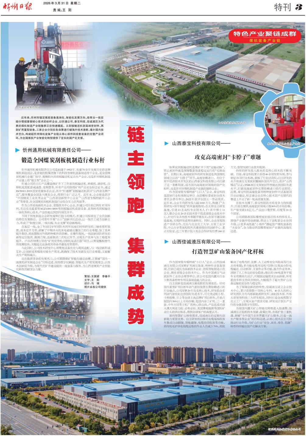 近年來,忻州市錨定煤炭裝備高端化、智能化發(fā)展方向,培育出一批在細(xì)分領(lǐng)域掌握核心技術(shù)的標(biāo)桿企業(yè),以忻通公司、泰寶科技、佳誠液壓為代表的煤機(jī)制造產(chǎn)業(yè)鏈集群正在快速崛起。從刮板輸送機(jī)到高端密封件,再到礦用重型裝備,三家企業(yè)分別在各自賽道打破海外技術(shù)壟斷、填補(bǔ)國內(nèi)技術(shù)空白,構(gòu)建起忻州煤機(jī)裝備產(chǎn)業(yè)鏈從核心部件到成套裝備的完整產(chǎn)業(yè)閉環(huán),為全國煤炭產(chǎn)業(yè)智能化轉(zhuǎn)型提供了堅實(shí)的國產(chǎn)化支撐。